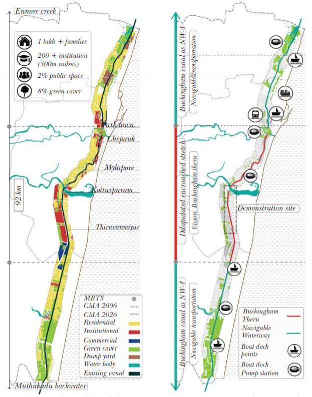 Originally a saltwater man-made canal, this vital waterway once served as the backbone of spatial and functional significance, threading through a large portion of Chennai city and linking neighborhoods and educational institutions. Over time, neglect and unchecked urban development have left it in a state of disrepair, with the MRTS line encroaching upon its stretch, rendering the canal unnavigable and forgotten.